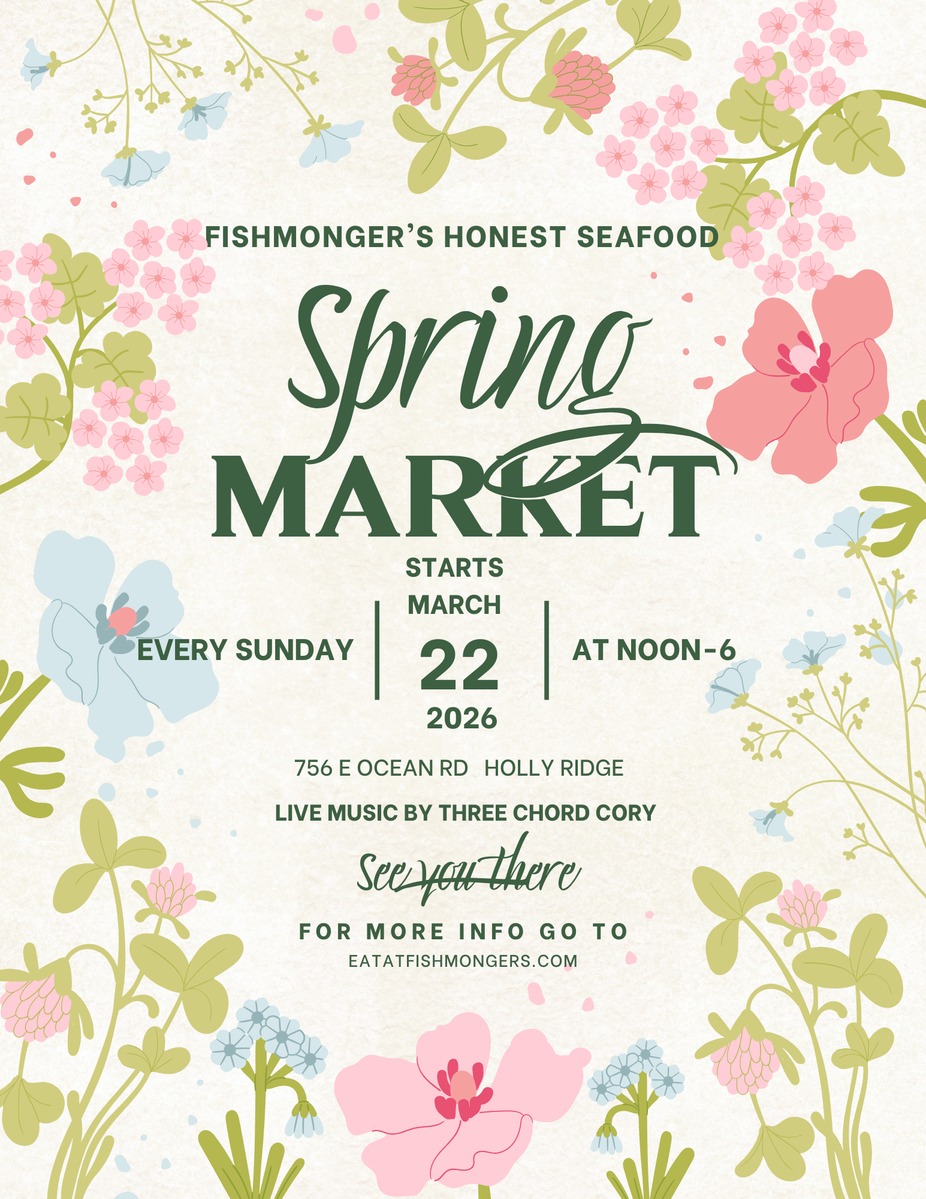 SPRING MARKET!! Come and enjoy our local vendors. Walk around and shop listen to great live music. Sit down either on our patio or in our dining room and enjoy delicious entrees and desserts!!! Every Sunday at noon until 6pm.