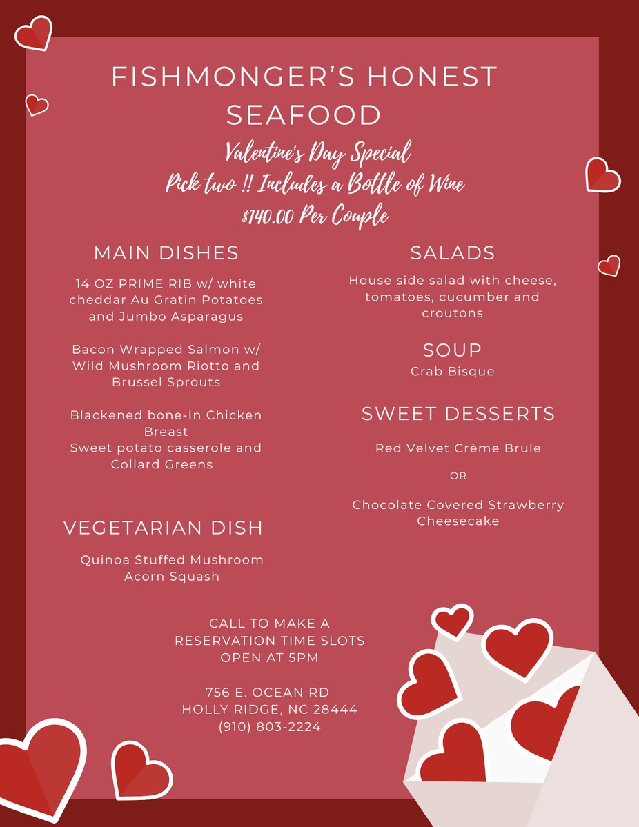 Join us on Valentine's Day for the perfect romantic evening! Call 910-803-2224 ask for Nikki or Dallas for presale tickets.